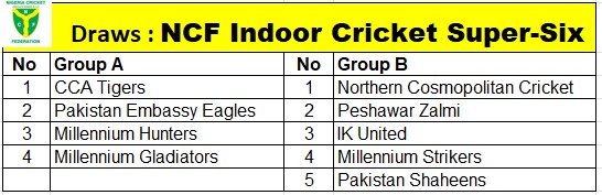 In the Draws that was done yesterday at the NCF Cricket Oval, Pitch 1, the Cricket Club of Abuja (CCA) Tigers, Pakistan Embassy Eagles, Millennium Hunters and Millennium Gladiators were balloted for Group A while the Northern Cosmopolitan Cricket, IK United, Peshawar Zalmi, Millennium Strikers and Pakistan Shaheens are in Group B.
