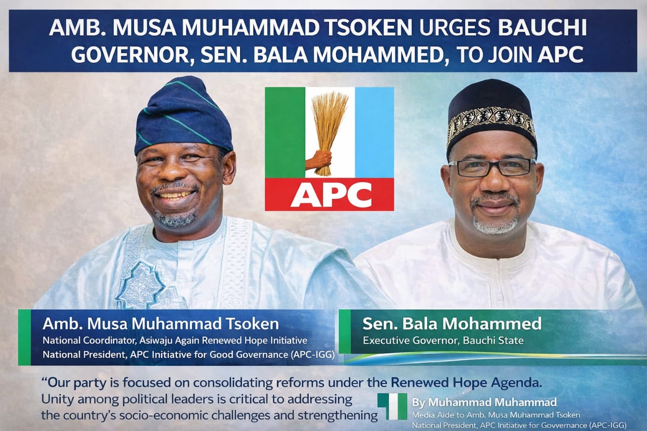 Ambassador Musa Muhammad Tsoken, National Coordinator of the Asiwaju Again Renewed Hope Initiative and National President of the APC Initiative for Good Governance (APC-IGG), has called on the Governor of Bauchi State, Senator Bala Abdulkadir Mohammed, popularly known as Kauran Bauchi, to join the All Progressives Congress (APC). He made this call in the interest of strengthening democratic collaboration and fostering inclusive governance at both the state and national levels.