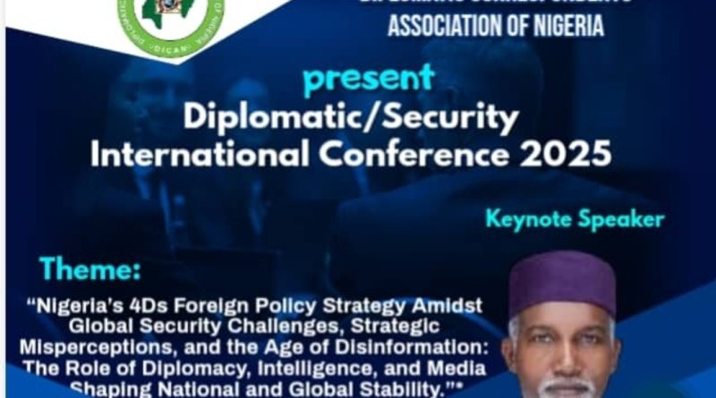 According to a press statement made available to by the DICAN Chairman, the all important event which takes place in Abuja and will focus on Nigeria’s foreign policy direction amidst rising global uncertainties. The conference theme, “Nigeria’s 4Ds Foreign Policy Strategy Amidst Global Security Challenges, Strategic Misperceptions, and the Age of Disinformation: The Role of Diplomacy, Intelligence, and Media in Shaping National and Global Stability,” reflects the complexities of the current global landscape.