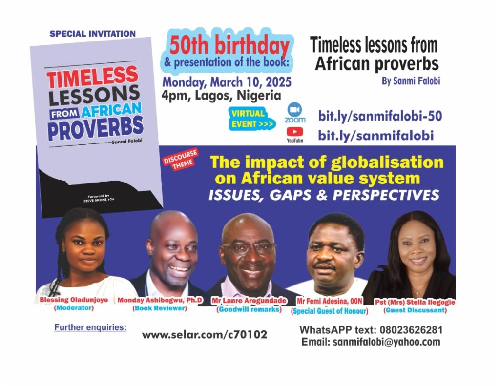 The session, which shall also feature Mrs Stella Ilegogie, family life coach and Associate Head Pastor at Lively Stones Assembly International -(LSAI) Kaduna is part of the 50th birthday celebrations and public presentation of the book, ‘Timeless lessons from African proverbs’ by Sanmi Falobi, notable NGO intraprenuer, Media & management consultant.