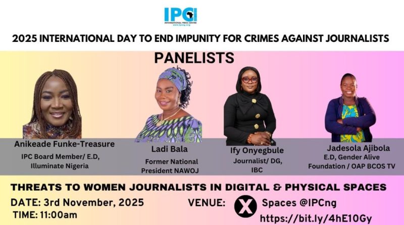 On the occasion of the International Day to End Impunity for Crimes Against Journalists (IDEI), the International Press Centre (IPC), Lagos – Nigeria, through its Safety and Protection of Journalists (SPJ) Hub is organizing a Twitter (X) Space conversation https://bit.ly/4hE10Gy on threats to women journalists in digital and physical spaces.