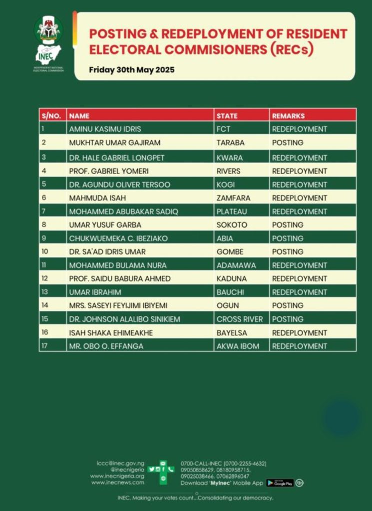 In line with INEC’s established policy of neutrality, the new RECs have been posted within their geopolitical zones but not in their states of origin, a deliberate effort to strengthen public confidence in the Commission’s independence. The consequential redeployments of some existing RECs were also carried out and will be published on INEC’s official platforms.