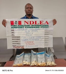 Barely two weeks after operatives of the National Drug Enforcement Agency (NDLEA), at the Mallam Aminu Kano International Airport (MAKIA) Kano, intercepted a 60-year-old businessman Chinedu Leonard Okigbo heading to Iran with 65 pellets of cocaine in his stomach, their counterparts at the Port Harcourt International Airport (PHIA), have arrested another businessman, 44-year-old Ezemokwe Chukwuebuka Christian for ingesting 53 wraps of the same class A drug while on his way to Tehran Khomeini, Islamic Republic of Iran.