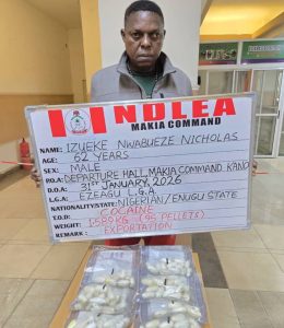 Operatives of the National Drug Law Enforcement Agency (NDLEA) have arrested a 62-year-old Lagos-based businessman, Nwabueze Nicholas Izueke, at the Mallam Aminu Kano International Airport (MAKIA), Kano, after he was found to have ingested 95 wraps of cocaine while attempting to travel to China.