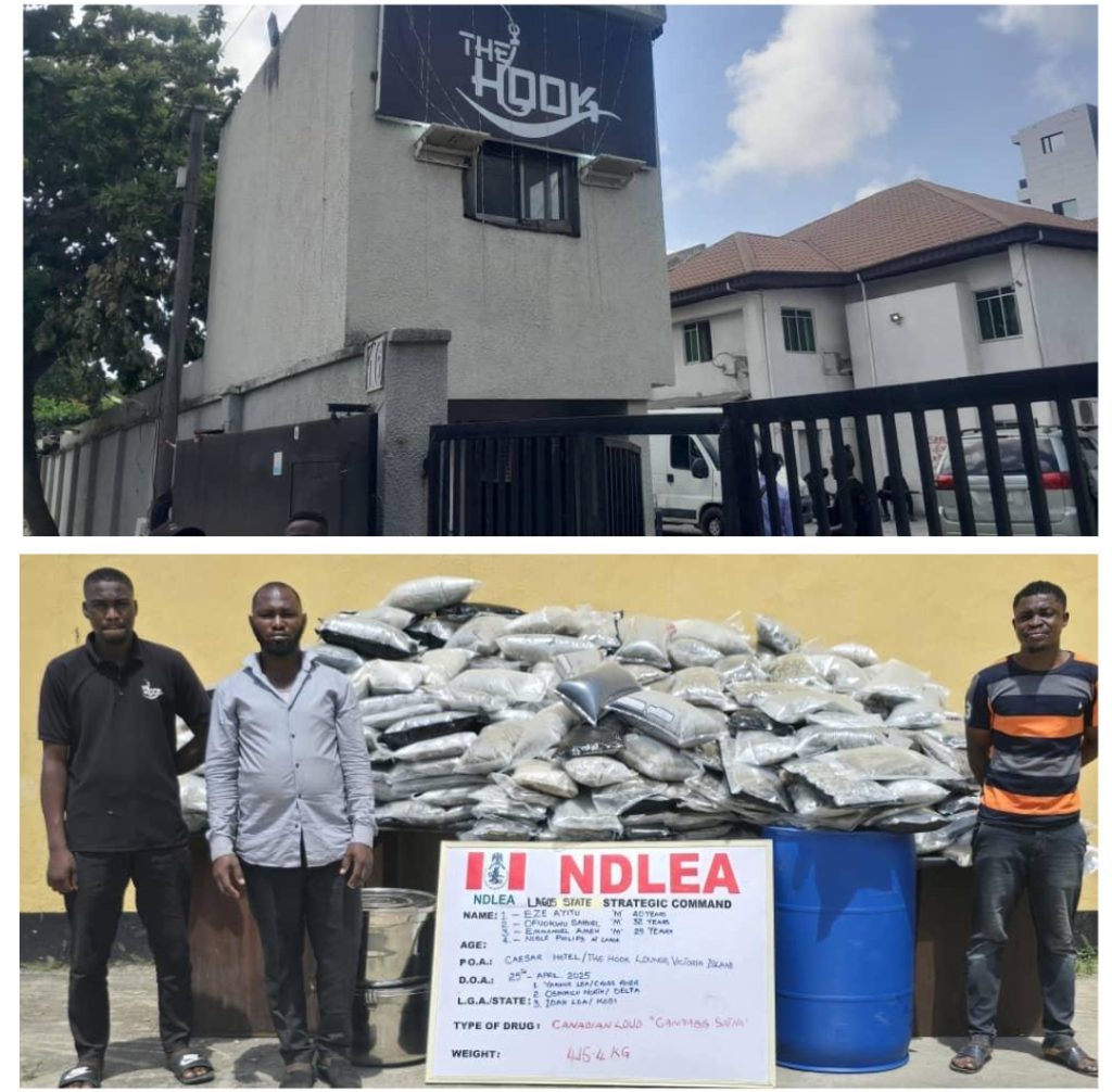 An 80-room new hotel in Victoria Island Lagos used as cover for distributing illicit substances has been raided by operatives of the National Drug Law Enforcement Agency (NDLEA) who after hours of combing the rooms recovered 589 bags of Canadian Loud, a strong strain of cannabis with a total weight of 417.3 kilograms worth One Billion Forty-Two Million Five Hundred Thousand Naira (₦1,042,500,000) only in street value.