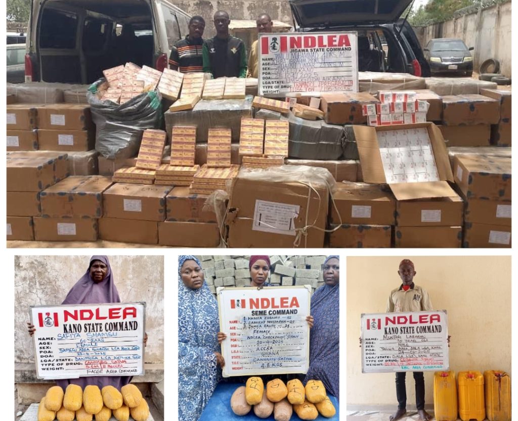 In Kano, a 60-year-old grandma Safiya Shamsu was on Friday 25th April nabbed at Samegu area of Kumbotso LGA with 5.6kg skunk, a strain of cannabis, while another suspect Muntari Labaran, 35, was taken into custody following the seizure of 100 litres of codeine syrup from him at Yelwa area of Dala LGA.