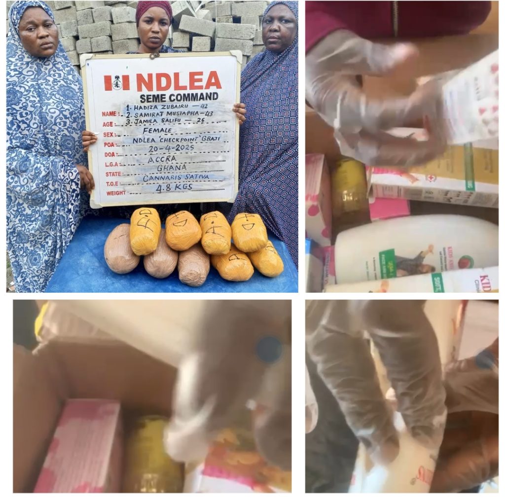 At the Seme border area of Badagry Lagos, three Ghanaian ladies were on Sunday 20th April arrested at the Gbaji check point by NDLEA operatives while attempting to smuggle combined 4.8kilograms of Ghana Loud, a strong strain of cannabis into Nigeria. The suspects arrested include: Haziza Zubairu, 42; Samirat Mustapha, 43; and Jamila Salifu, 26.