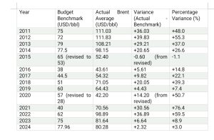 Nigeria’s economy is heavily reliant on crude oil revenues, which account for over 80% of export earnings and a significant portion of Federal Government income. The Federal Government of Nigeria (FGN) uses an oil price benchmark in its annual budgets, Medium-Term Expenditure Frameworks (MTEF) and Fiscal Strategy Paper (FSP)  to project revenues and guide fiscal planning, in line with the Fiscal Responsibility Act. This benchmark represents an estimate of the average crude oil price (typically Brent or Bonny Light) for the budget year, often set below market forecasts to mitigate risks of shortfalls. However, historical data from 2011 to 2024 reveals persistent variances between these projections and actual average prices, leading to fiscal imbalances.