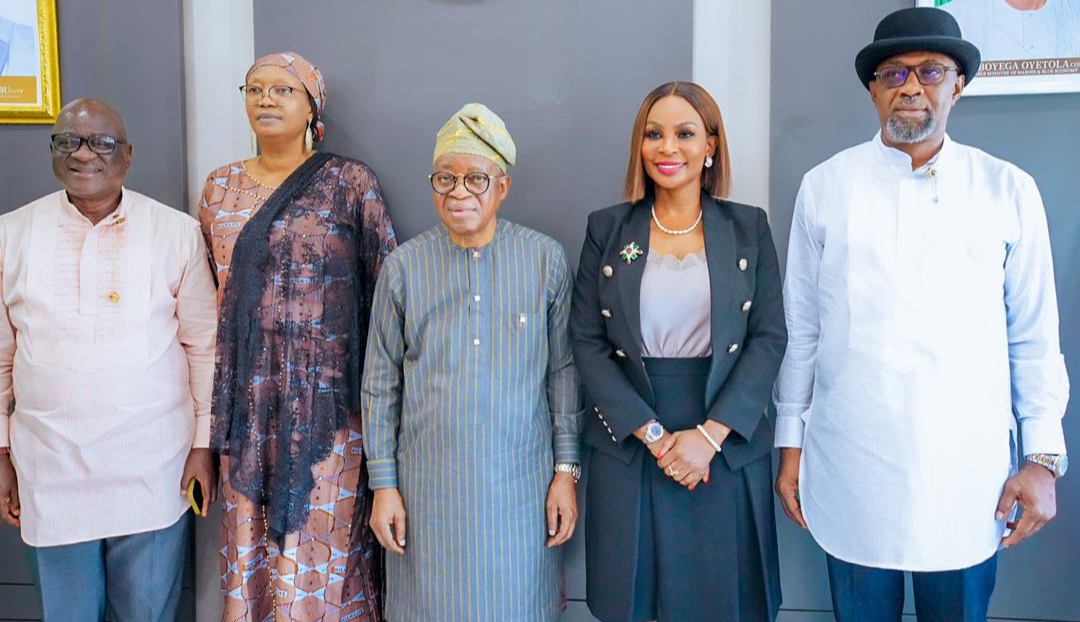 Vover Photo Caption: Minister of Marine and Blue Economy, Dr Adegboyega Oyetola (middle); Managing Director, South South Development Commission (SSDC), Ms Usoro Akpabio (second from right) and SSDC Board Members Hon Larry Odey; Hon Tabitha Salah; and Engr Chika Chinda, Hon Larry Odey when the SSDC delegation visited the Minister in his office in Abuja on Tuesday.