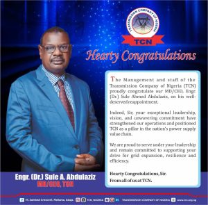 The Management and staff of the Transmission Company of Nigeria (TCN) have congratulated their Managing Director and Chief Executive Officer, Engr. (Dr.) Sule Ahmed Abdulaziz, on his reappointment.