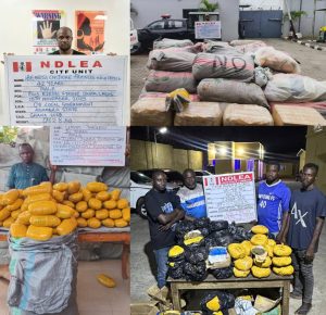 Two suspects: Jamiu Kunle Kardoso and Oriyomi Waliu were on Friday 14th November arrested with 130 pouches of Canadian Loud weighing 65.150kg in Surulere area of Lagos, just as Taofeek Moraina was nabbed same day with 282 blocks of Ghana Loud with a gross weight of 141kg at Otto, Oyingbo area of Lagos.